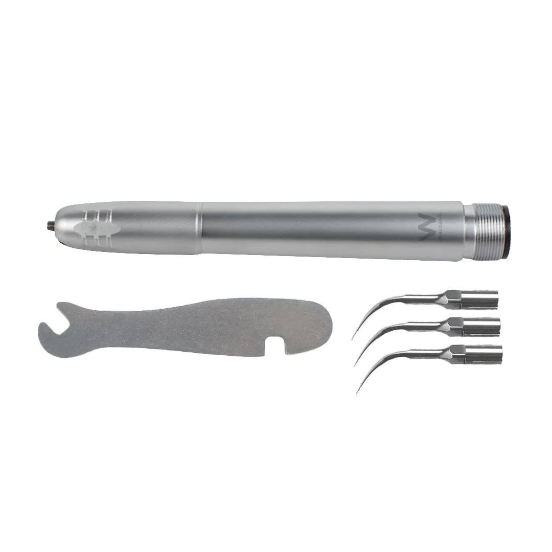Waldent Air-scaler is a compressed air driven instrument with the integrated water spray outlet. This Air Scaler is a sonic device with less amplitude as compared to Ultrasonic devices. This make it as an ideal tool for performing dental treatments on pain sensitive patients.