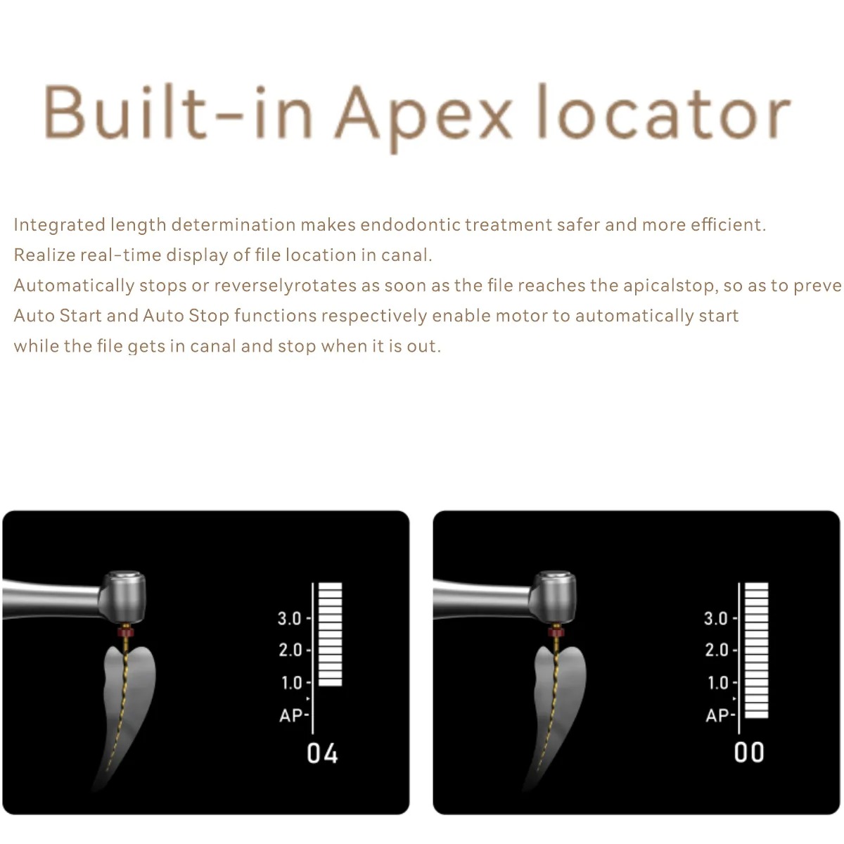- Integrated Apex Locator: Real-time monitoring of canal length during the procedure & ensures safe and precise root canal preparation